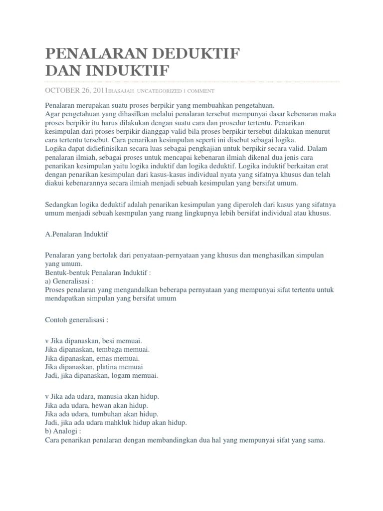 • suksesnya penalaran induktif tergantung pada kualitas. Penalaran induktif, atau induksi, adalah penalaran dari kasus atau kasus tertentu dan ini bertentangan dengan metode ilmiahnya. Definisi dari penalaran secara umum adalah proses berpikir yang bertolak dari pengamatan indera (observasi empirik) yang menghasilkan. Proses berpikir tentang sesuatu, secara rasional, sehingga menarik kesimpulan yang valid, dikenal sebagai penalaran. Alternatif dari penalaran deduktif adalah penalaran induktif. Sedangkan penalaran induktif, secara bahasa berarti penalaran yang bersifat induksi, yaitu. Pola penalaran secara sederhana dibedakan menjadi dua: Pola pikir induktif dapat membantu siswa menuju pola berpikir deduktif. Penalaran induktif terdiri dari terdiri dari tiga jenis yaitu: Pola penarikan kesimpulan tidak langsung atau silogisme, dapat dikelompokan kedalam beberapa jenis: Pola penalaran deduktif menggunakan bentuk bernalar deduksi. Penalaran deduktif dan induktif makalah untuk memenuhi salah satu tugas mata kuliah bahasa indonesia yang dibimbing oleh habib wakidatul ihtiyar, m.h. Generalisasi, analogi dan hubungan kausal (sebab akibat).