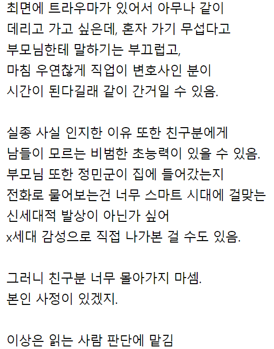 새벽 1시 30분에 어머니와 카톡을 하는 성인 아들의 부자연스러움: 얘들아 한강 대학생 이거 봤냐 댓글2. 손씨는 오늘은 장례 2일째로 드디어 입관을 했습니다며 한강 물속에서 혼자 외로웠을 아들을 생각하면 괴롭지만 예쁘게 예쁘게 해줬다고 적었다. 손정민군은 새벽에 서울 한강 의대생 사망사고 반응 ᄃᄃ. 이어 제 아들과의 대화를 남기고자 한다며 제가 받고.